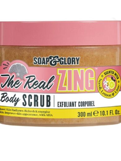 SOAP & GLORY The Real Zing Body Scrub - Smoothing & Buffing Sugar Scrub - Lemon Citrus Scented Body Polish - Skin Brightening Sea Salt Scrub - 300ml