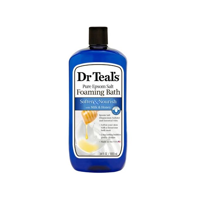 Take time out for yourself with Dr Teal’s Foaming Milk Bath. It transforms an ordinary bath into a moisturizing spa experience by combining real milk protein with vitamins A, D and E to soften and improve the skin’s condition. Milk and honey are used in bath rituals for their nourishing qualities, leaving skin soft and touchable. This 34 fluid ounce container creates long-lasting bubbles that gently cleanse the body while also softening and nourishing it.Dr Teal’s Soften & Nourish Foaming Bath with Milk and Honey: